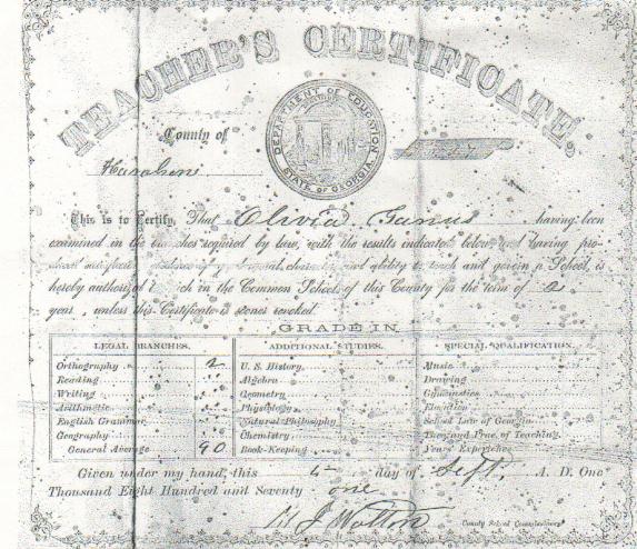 Olivia was born on the 20th of February 1831 in Hall County, Georgia to Joshua Rainwater and Mary Peterson. She was the 4th of six children, four of which were girls. Her life seemed to follow the normal pattern for girls of that time period. She lived with her parents until the age of 21, at which time she married John Monroe Ganus on the 7th of October 1862 in Cedartown, Polk County, Georgia. As was common then, John farmed and they soon began their family, with their first son being born a little over a year later. John and Olivia would have a total of 8 children, with five sons surviving through adulthood. Everything seems to point to a normal every day life for a Georgia family during the mid 19th century, until you factor in her Teacher’s Certificate.
