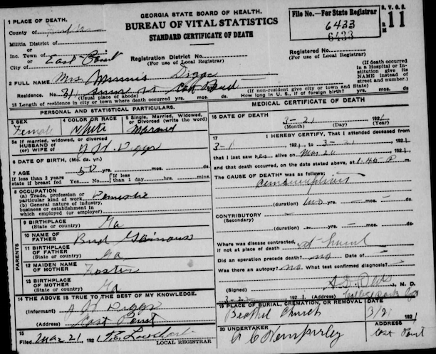 “Mrs. J. H. Diggs, 50 years old, died Sunday at the residence in East Point. She is survived by four sons, J.C., J.E., J.F. and H.O. Diggs and three daughters, Mrs. H.D. Eidson and Misses Elizabeth and Lucile Diggs.” [2]